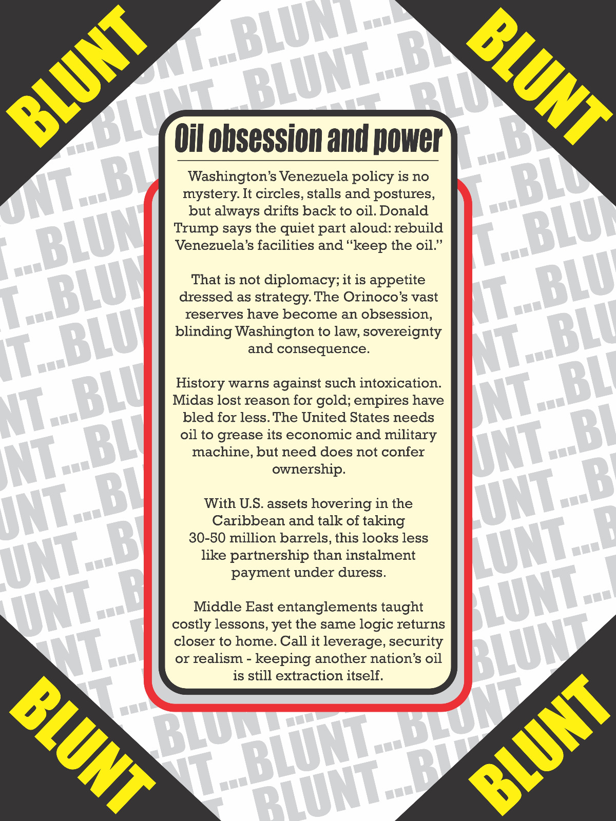 (Kaieteur News) – When former President Donald Ramotar speaks these days, I listen. He is due a hearing, and I urge Guyanese to listen. His latest contribution drips with pragmatism, warns of the precautionary steps that other nations may embark upon, and then what? That contradiction...Freedom of speech is our core value at Kaieteur News. If the letter/e-mail you sent was not published, and you believe that its contents were not libellous, let us know, please contact us by phone or email.
