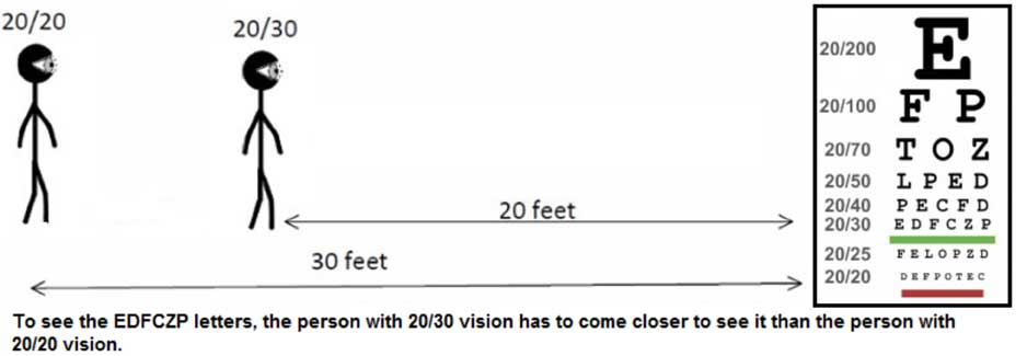 That translates in numbers to the 20/20 letters being 8.75 mm high. If you have 20/20 vision, from 20 feet away, you can see clearly 8.75 mm high letters that make up the 20/20 line. If you have 20/30 vision, it means that you must go as close as 20 feet to see a size letter that a person with normal vision can see from 30 feet back.